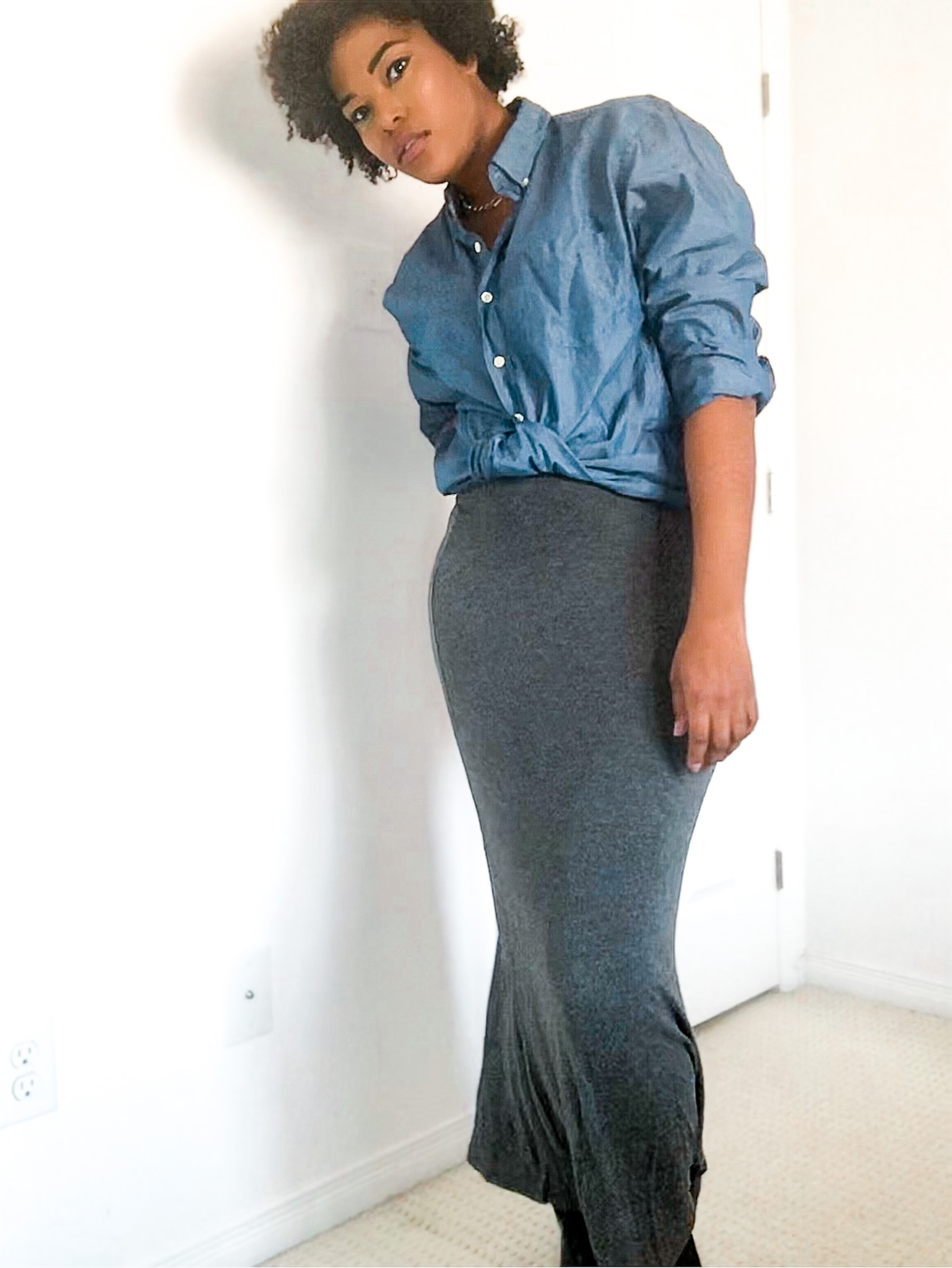 I love long skirts. It’s like a blanket for my legs except there’s an opening at the bottom. I chose this grey lightweight ankle length skirt because in my opinion it makes my legs appear longer and taller…and because it’s like having a blanket around my legs.