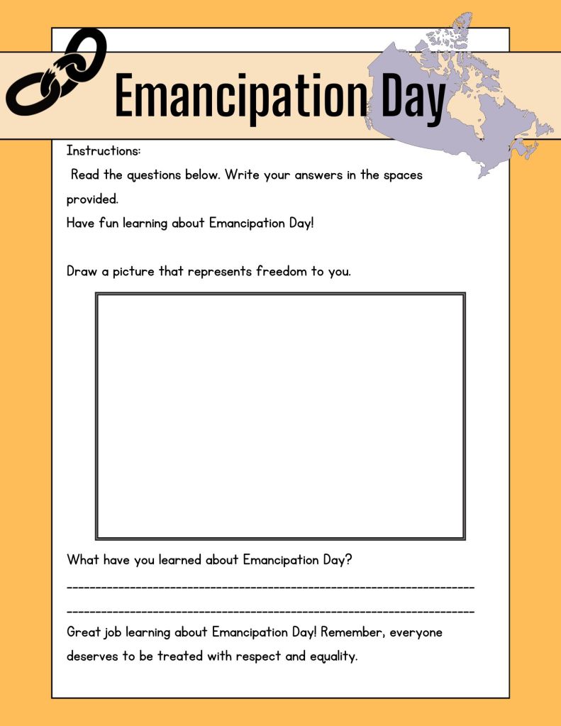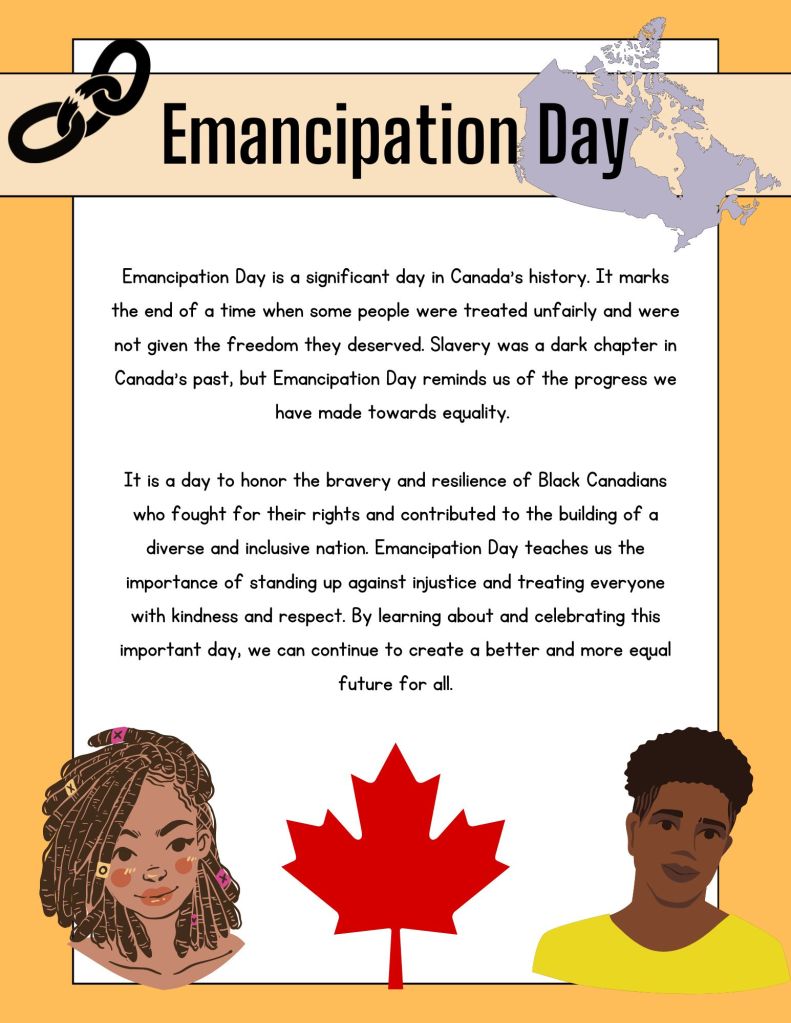 Canadian Emancipation Day, celebrated on August 1st, marks the anniversary of the Slavery Abolition Act of 1834, which abolished slavery in the British Empire, including Canada. It is a time to reflect on the struggles endured by enslaved individuals and recognize the importance of freedom and human rights. By teaching children about this significant event, we honor the resilience and courage of those who fought for emancipation and create a space for dialogue about the ongoing fight against discrimination and systemic inequalities.